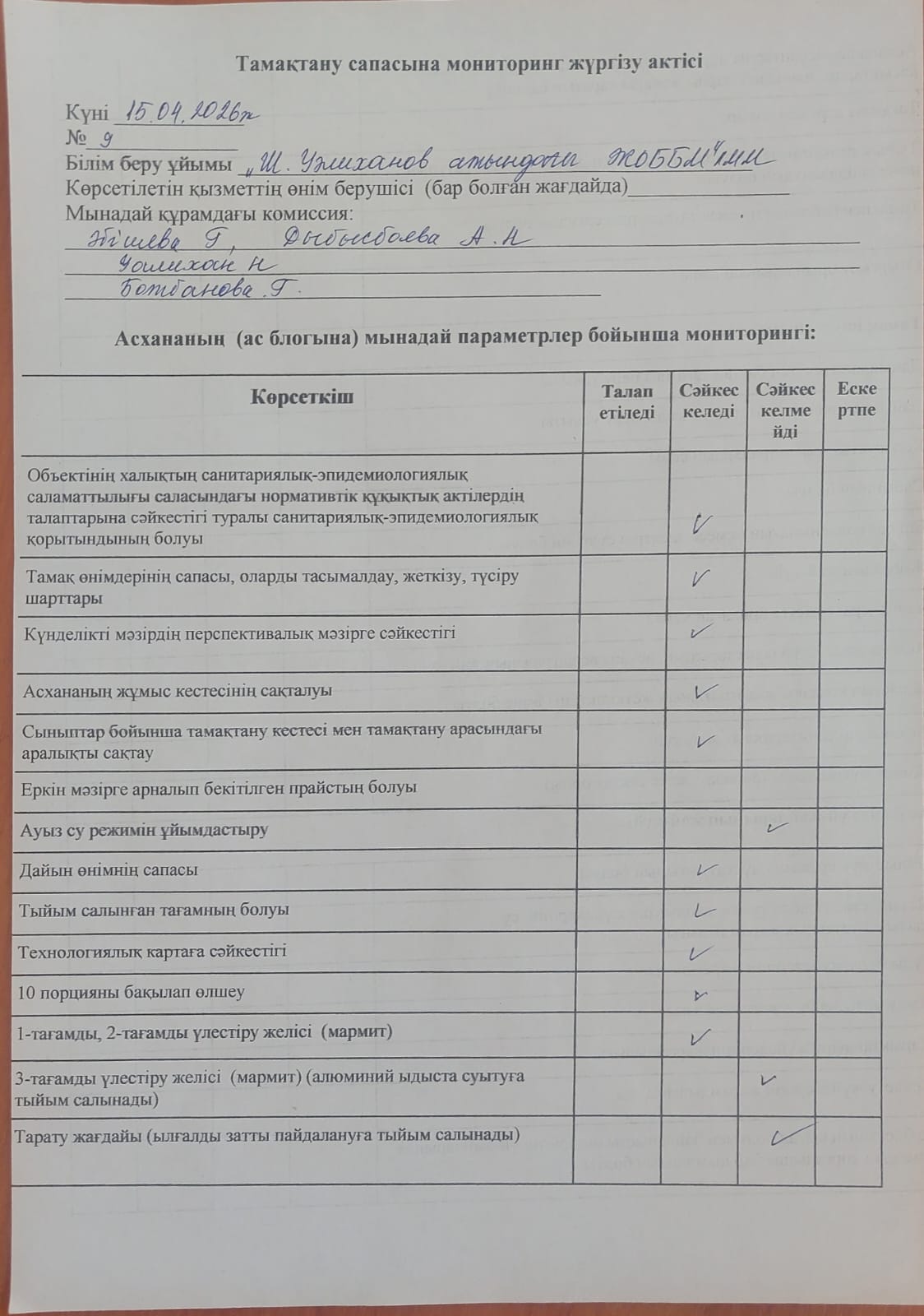 Тамақтану сапасына мониторинг актісі
