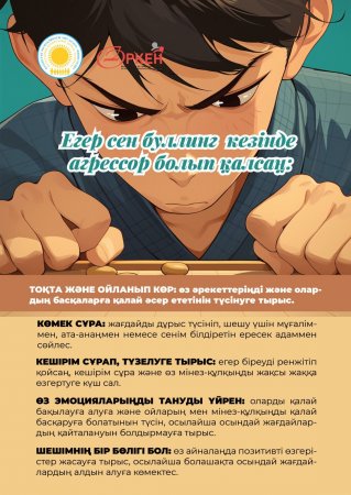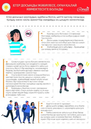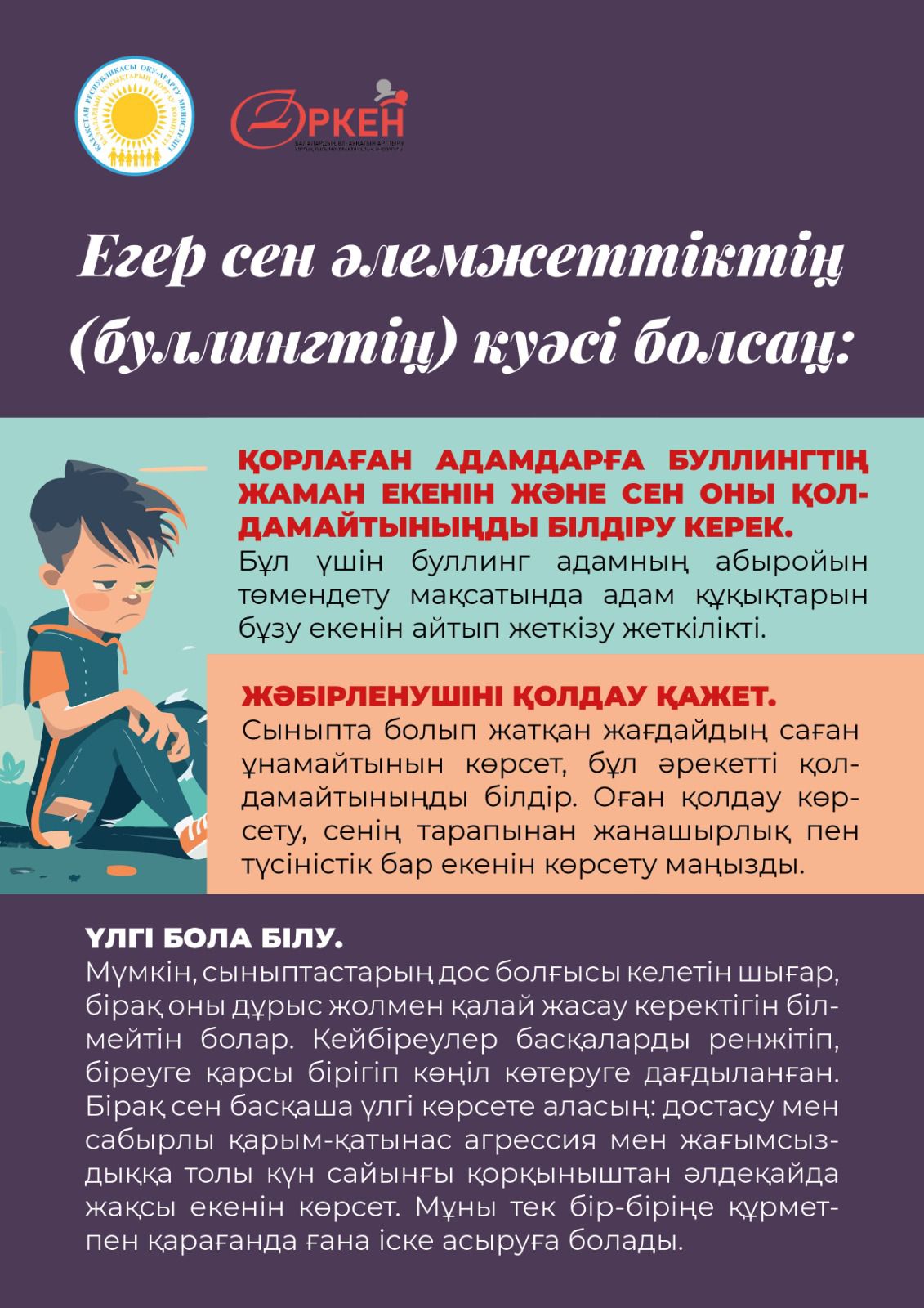 "Өркен" балалардың әлеуетін арттыру ұлттық ғылыми - практикалық институты "Егер досыңды жәбірлесе оған қалай көмектесуге болады" тақырыбында әзірлеген ақпараттық ресурстарымен оқушылар топтарына жіберіліп, ақпараттандырылды.