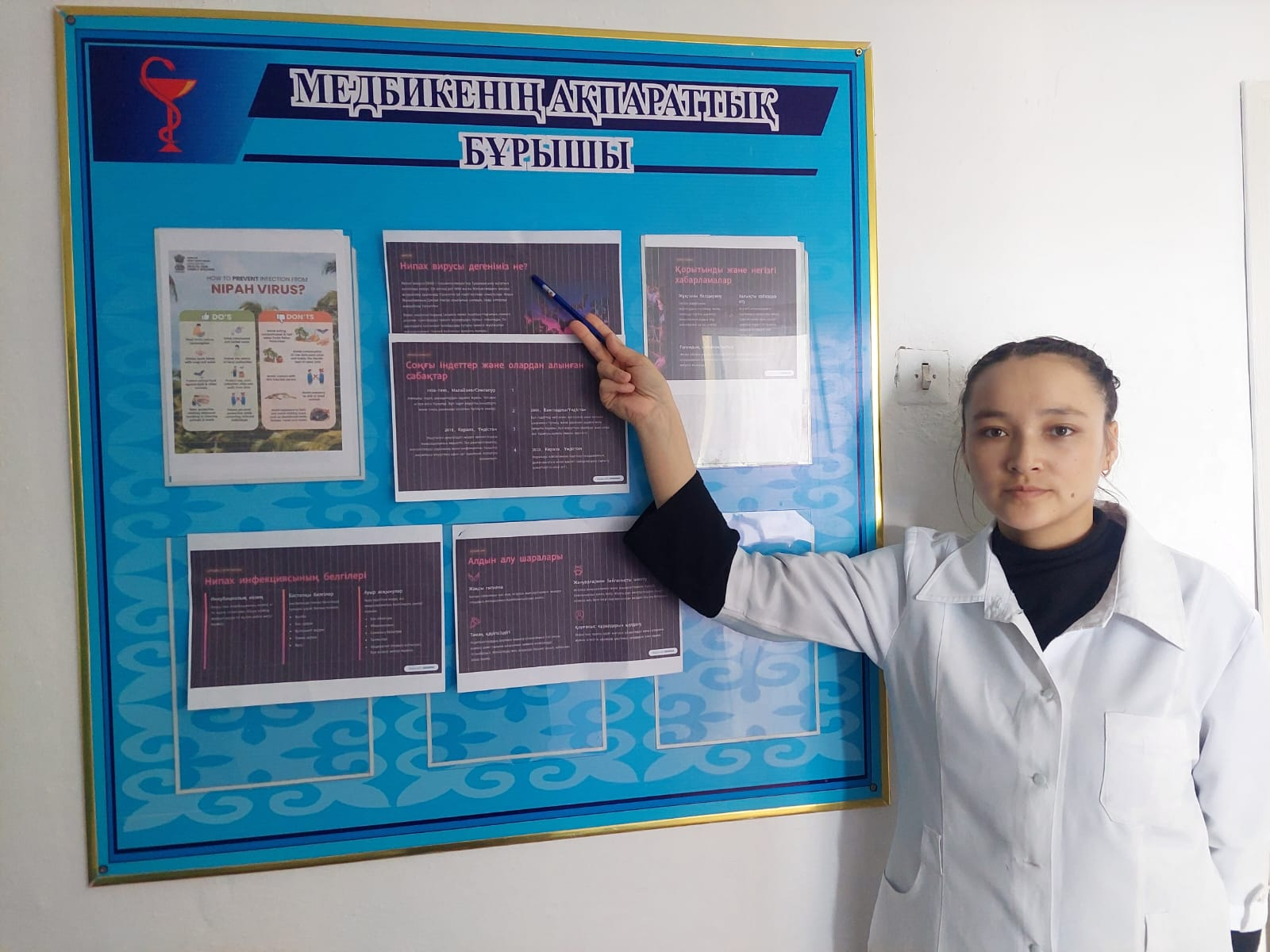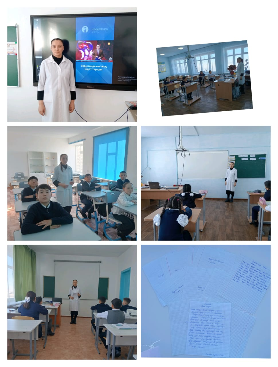 Мектеп медбикесі Уалихан Нұрай 2026 жылы 30 қаңтарда оқушыларға "Нипах"вирусы туралы түсіндірме жұмысын жүргізіліп, диктант алынды. Мақсаты — Оқушыларға жұқпалы ауру туралы мәлімет беру, алдын алу шаралары, ауру белгілері байқалған жағдайда дереу дәрігерге қаралу маңыздылығын түсіндірді.